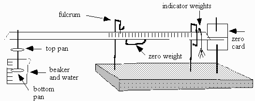 With an electronic balance the procedure is similar except that only one balance pan is used. As you will not be able to zero the balance the weight of the spiral cage suspended in water is the zero weight and all calculations are done from this reference point. eg. if it weighs .3 grams then subtract .3 grams from all calculations.
