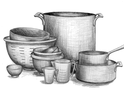 To prepare the studio for patinas, collect a wide assortment of pots and pans. The size you need will depend on the kind of work you do, but you'll want a wide range at your disposal. Plastic tubs and buckets are useful, as are deli containers. In all cases, these vessels will be permanently retired from use in the kitchen.