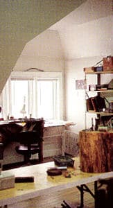 The Gosses' studio occupies a renovated third-floor attic. White walls, plants, and lots of windows give the space an airy feel. In the winter Georgian Bay is visible, as is the river that runs behind their property. It's hard to believe that the house is right downtown. Each artist's bench is beside a window; the adjacent walls reveal their individual sources of inspiration. Andrew's philosophical bent is evident through poems and quotations from thinkers such as Lao Tzu and Andre Breton. In Sandra's area, images of paisley designs, seashells, and a postcard of the young Queen Elizabeth II in full regalia reveal her appreciation of intricate pattern.