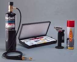 When the only demand on the torch is soldering small items, then most of the hand-held, self-starting torches like the Micro-Jet MJ-300 ($20) and the Blazer Butane Microtorch will do the job. These inexpensive mini and micro single-gas torches produce a pinpoint 2500°F flame powered by readily available butane.