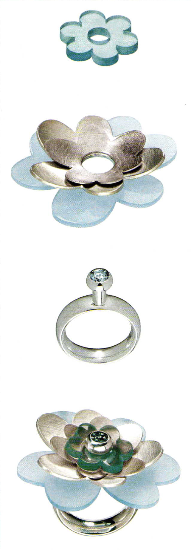 The transformable jewelry system Charlotte conquered the hearts of customers and jewelers alike with its simple and equally brilliant concept almost like lightning: Various jewelry elements made of gemstones or enameled silver, or also discs made of mother of pearl, velvet or ebony are inserted over each other on a basic ring made of silver, gold, stainless steel or platinum. Once the creative combination is complete, a small spring-type star holds everything in place. This means that - depending on the way in which they are stacked - just 10 individual pieces can be used to create 100 different items of jewelry. In total, the system now has 4,000 individual components, divided into three systems with different characters.