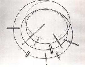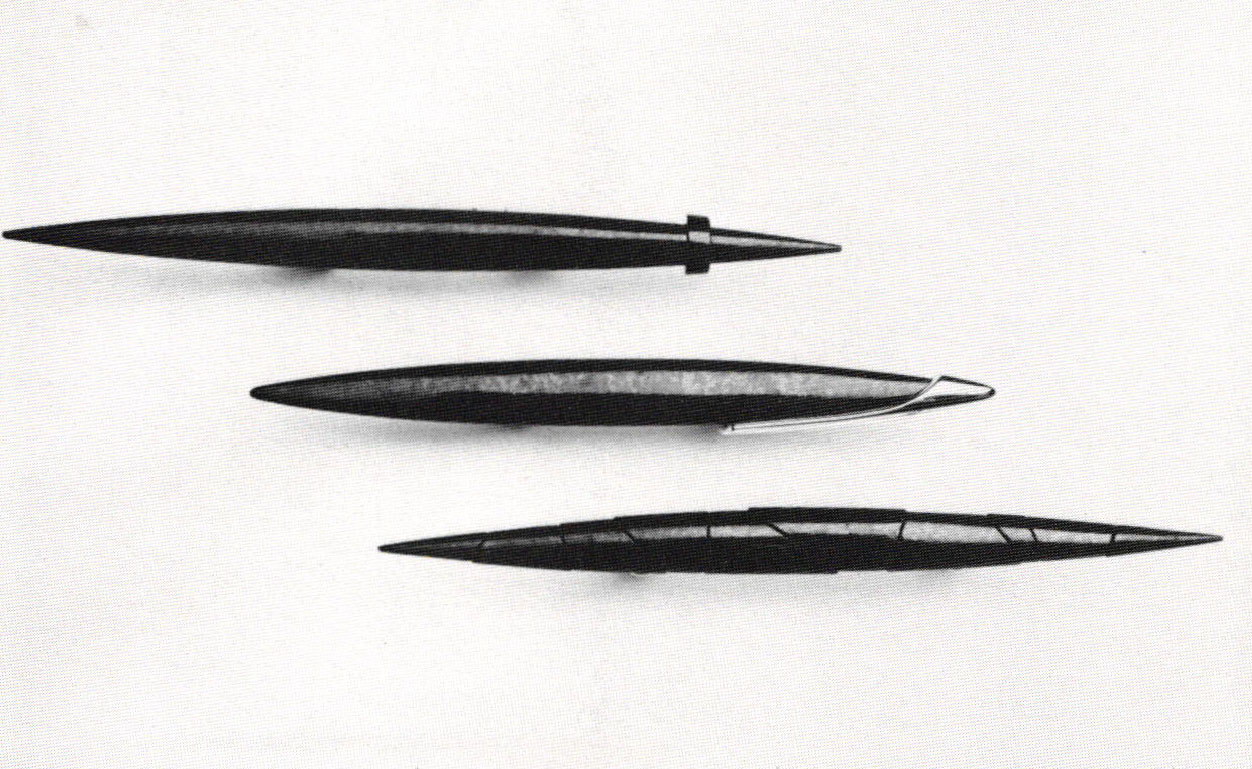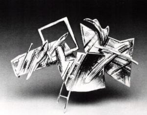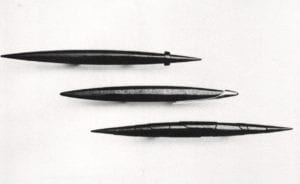 Approaching the border, the swells of expression seemed to quiet. A kind of silence pervaded the international section. There seemed to be a kind of coherency (possibly due to the fewer pieces selected for this phase of the exhibition). Shadow games with purist and nonobjective geometric configurations were in abundance. An older model, Modernism, was still holding sway. What about the celebrated cause Post Modernism? Had Post-Modernist concerns escaped the European and Japanese jewelers?