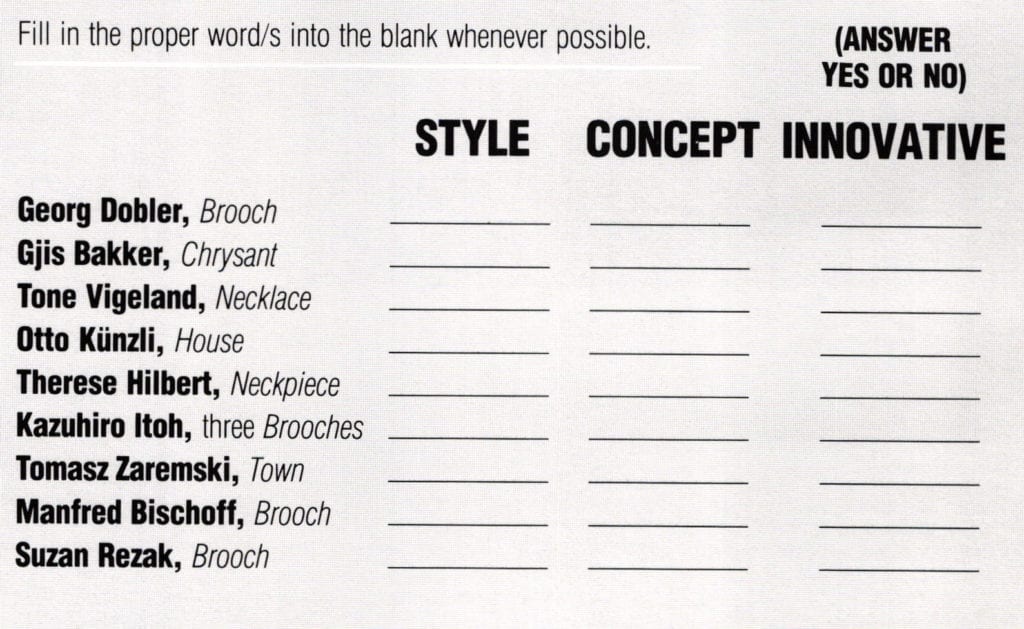 A checklist of other jewelers (see visuals accompanying this essay). An admonition: this phase of the essay is not meant to be definitive, but as Roland Barthes would hope for: An exploration into the plurality of texts. The reader should create his/her own text, even criticism. The first step is to realize what Mallarmé pointed out at the end of the last century: All methodology is a fiction.