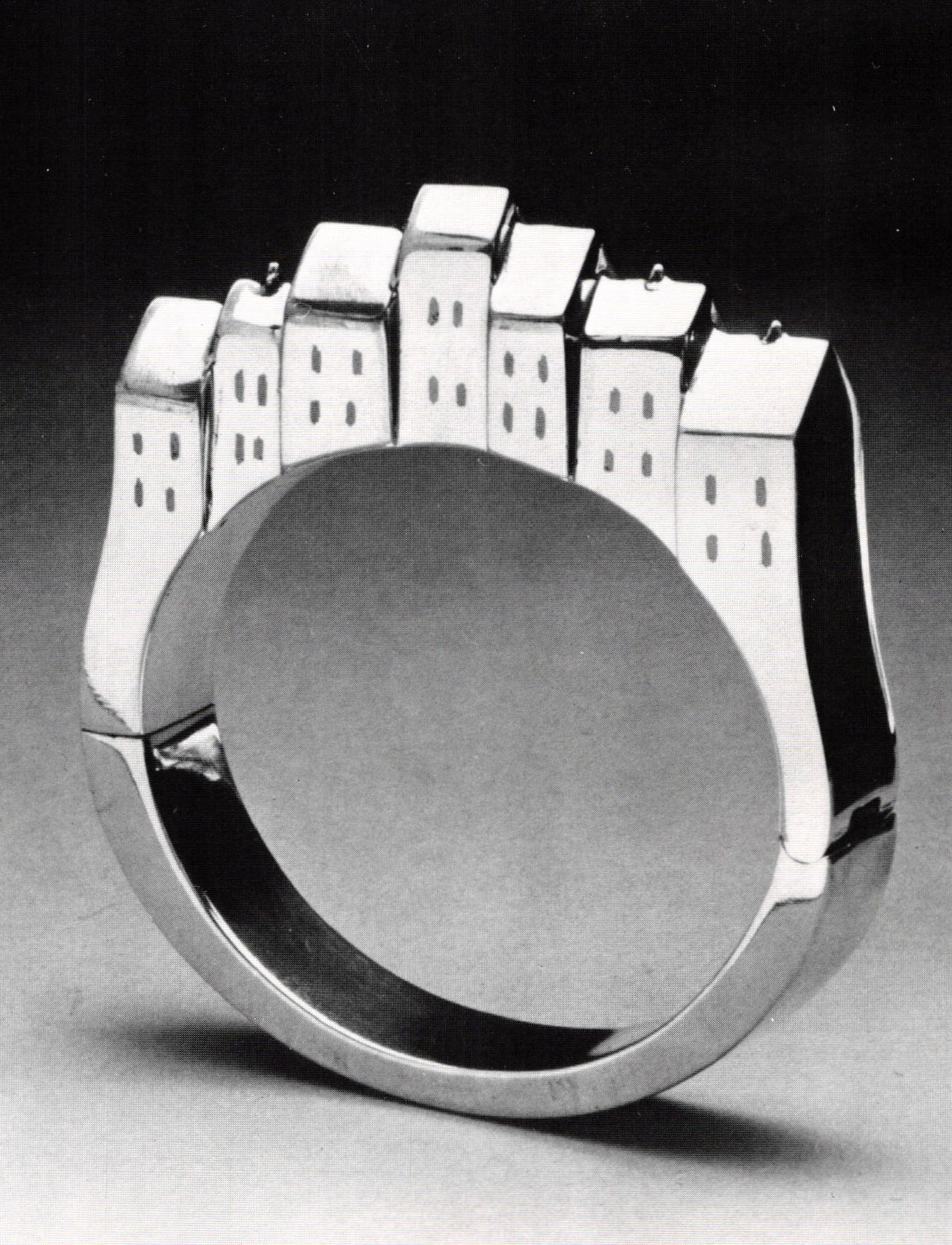 | Manfred Bischoff, West Germany, Brooch Sheet metal, paint, 3¾ x 5 x ½" Photo: Ralph Gabriner | Tomasz Zaremski, Poland, Town bracelet, Silver, copper, niello 1984 Photo: Ralph Gabriner |