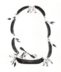 If "Jewelry USA" is to be taken as representative of contemporary American jewelry, then a kind of convoluted, punnish humor ought to be cited as a truly American characteristic. This literal humor and sense of play—as opposed to the more serious irony that distinguishes so much of the European and British jewelry—shows up in some very dissimilar pieces. Tina Fung Holder's neckpiece Contessa-SGX (#82), for instance, is an unpretentious, marvelously simple veil of gold and silver safety pins suspended on an "armature" if crocheted cotton thread. And Cat Glazer's Black and White Neckpiece (#58) has the energy of a hundred live and kicking legs—a string of Rockette legs dancing. Yet Glazer's reduced, repetitive modules and stark black/white color contrast lend the neckpiece and elegance that belies its whimsical associations. Laurie Hall's humor takes a more narrative turn, deriving some of its charm from the "aged" look of her materials and the folk-art sources it seems to tap. Her titles are more than clever and in her most effective work, such as Chief Bone Gone Fish' in Bone (#68), the narrative works to carry one's eye around the wearers' torso, unifying a necklace that also functions as a collection of charms or talismans. On the other hand, Jocelyn M. Merchant's brooch Repair (#119), while controlled and intentionally literal, comes off as a precious and fleeting play on words. I had similar problems with Kate Wagle's Party Trick II (#197) brooch and Gail Marie Fisher's Party Wear Series: Brush Bracelet (#42), although in Fisher's case the joke was funnier and had a more satiric edge. When compared with, for example, English jeweler Caroline Broadhead's Veil Collar (JI #21), these American pieces seem almost gratuitous. And the persistent inclusion of such self-indulgent items as David Freeda's Cuban Molasses pin (#49) or Peter Jagoda's Spurred on to Excess (#89) simply baffles me.