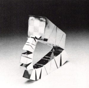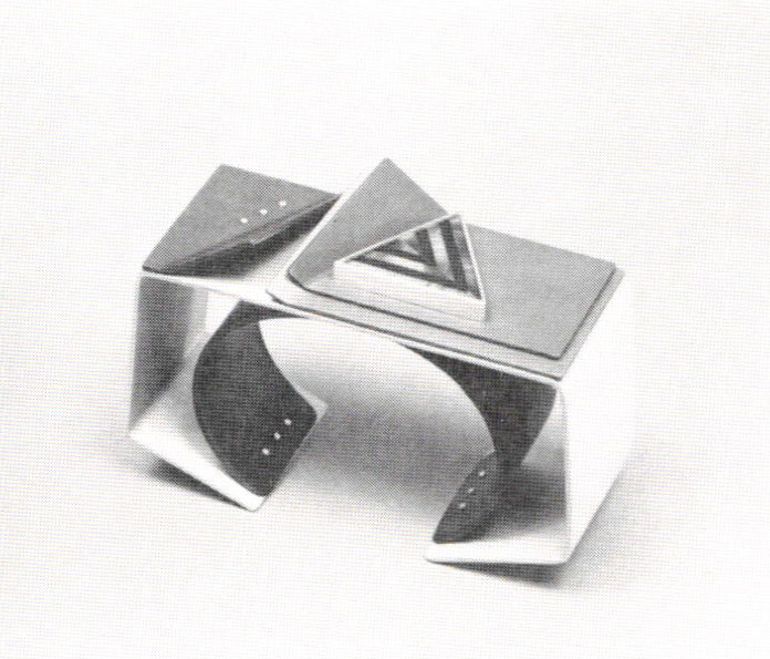 Rose Slivka offers a harsh, but insightful, response to this question in her review of last year's "New Departures in Jewellery." Her complaint centered on the notion of the American jeweler as "piranha"; the disarming, but all too prevalent tendency for American jewelers to appropriate and decontextualize stylistic or esthetic effects, while disregarding the sources that inspired them. For Slivka, the London-based jewelers were ". . . the most exciting phenomenon that has come our way in the last twenty years…. They have undertaken to pose the serious questions of our time—individual responsibility, social mores, status true and false, daring to tread the risky bridge between art and design, philosophy and politics and in so doing they project . . . an affirming spirit of courage and thought." Whereas: "In this country where revolution is considered an American tradition, the jewelers have played a conservative role. American jewelry is the most staid, the most concerned with 'clientele.' True, they have made technical and material innovations, particularly as 'sculpture to wear' in which they would appear to put formal values over gold and precious stones. Nevertheless. the largest part of the output has been the general run of 'chachkas' with technical and stylistic refinements and no ideas."
