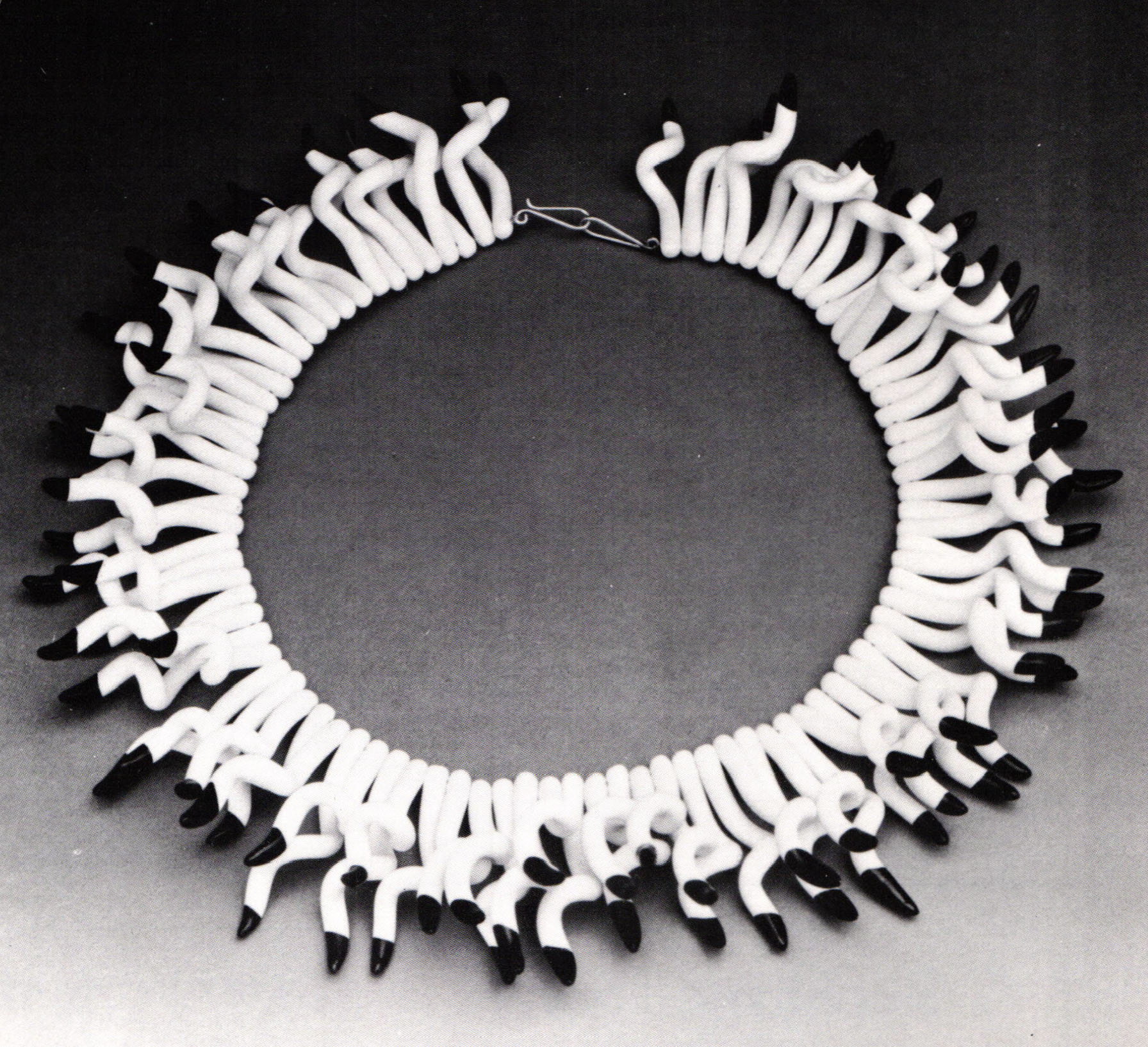 Fisch's boisterous, more whimsical collar and cuff conjure no such ironic or multivalent associations. Conspicuously free of historical or symbolic significance, they celebrate, instead, the liberation from more modest, conservative jewelry and the time-saving technical innovation of machine-weaving. The form, itself—less controlled and responsive to the body—is determined, to a great extent, by the machine-weaving process. And the color, while exuberant, seems somewhat arbitrary. Yet one feels that these considerations are not as important to Fisch. She seems far more interested in providing an immediate sense of delight and bemused pleasure, associating facility with felicity.