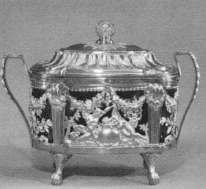 Although current research being conducted may help to bring to light other works by this important goldsmith, by far the best known of his works is a magnificent covered two-handled sugar basin, now in the collection of the Metropolitan Museum of Art, New York. This exceptional work, following closely the models for similar tabletop refinements made by 18th-century silversmiths, treats a neoclassical theme with grace and elegance.