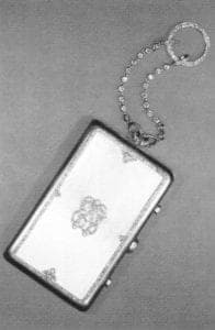 In the 19th century, platinum was among the variety of remarkable and diverse materials used in the workshops of Fabergé in Russia, not only as a setting for precious and semiprecious stones, but as the major material for bibelots such as ladies' compacts. Also at the Metropolitan Museum of Art is to be found such a compact—a rectangular flat box with a border of faceted diamonds. The compact is suspended from a chain of set diamonds and fined with a platinum and diamond ring intended to slip comfortably over a finger when the compact was in use.