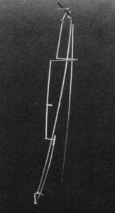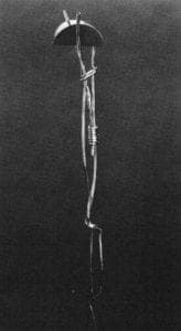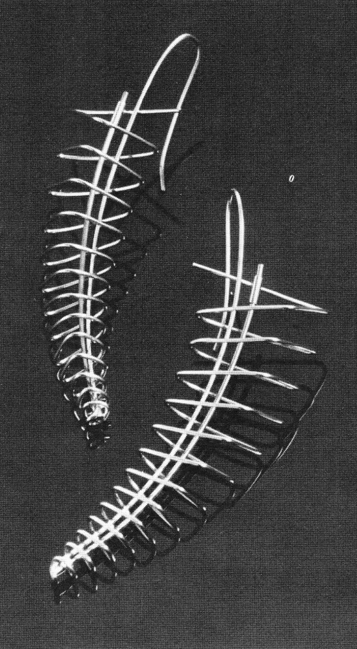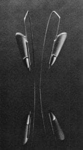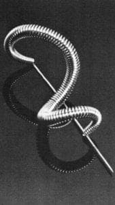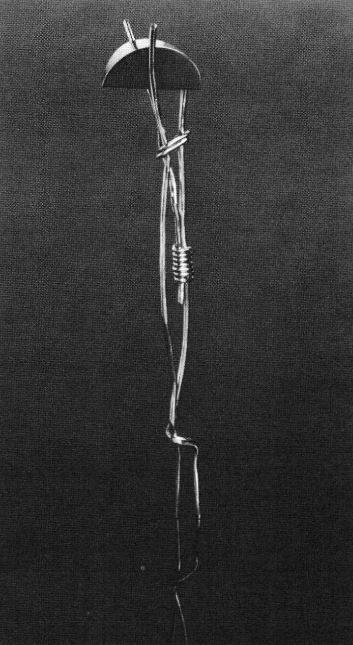 Even in his initial and anonymous sketch, the jury recognized that the design contained a delightful promise that was admirably fulfilled in the finished work. The two second prize designs clearly fell within the framework of a number of earlier designs that exploited the impressive strength of the material. Both Tom Muir s and Myra T Mimlitsch's brooches made effective use of platinum wire to create evocative abstract shapes. While Muir's earrings appeared to be skeletons of architecture, Mimlitsch's brooch combined the simplicity of a found object—a segment of barbed wire—with the provocative poetry of a ritualistic symbol.