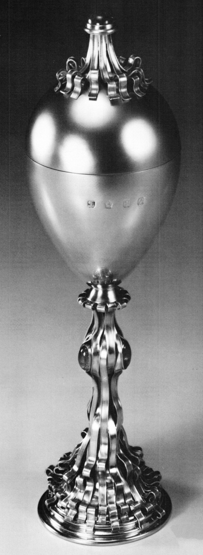 It was not until the mid-1970s that platinum was accorded a place of honor among the precious metals in England, where a special series of marks for platinum was first used. The first vessel bearing the British platinum hallmark was commissioned from Jocelyn Burton in 1976, a covered standing cup with a stem and finial composed of undulating bands of platinum.