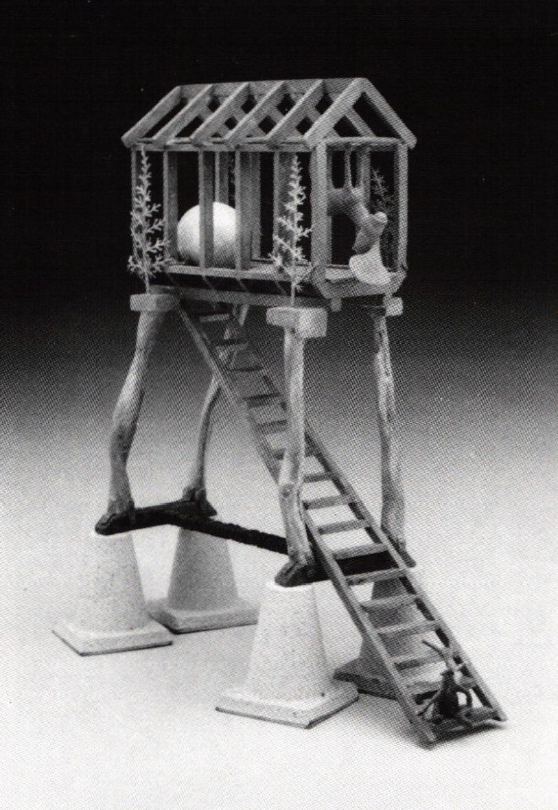 The painted bronze castings of Rand Schiltz (San Jose, CA) presented some fresh forms and whimsical themes. They appear to be multiple piece castings (four were exhibited) that are joined together almost as if they were folk art wood constructions. The colors are light and lyrical, and the subject matter is very narrative and certainly erotic. Jurying from slides can provide some real surprises. Since the works are only about 14 inches high, the detailed and erect male genitalia on three of the pieces were totally unnoticed by the jurors when they viewed the slides. However, they were noticed by many viewers, a few of whom let it be known to the museum personnel that they were not pleased. To the credit of the museum director, the pieces remained on full view throughout the exhibition.