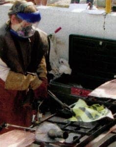 Ben utilized safety first. He wore a face shield with chin guard, respirator, leather apron, welder's gloves, long pants, turtle neck, boots and ear plugs.