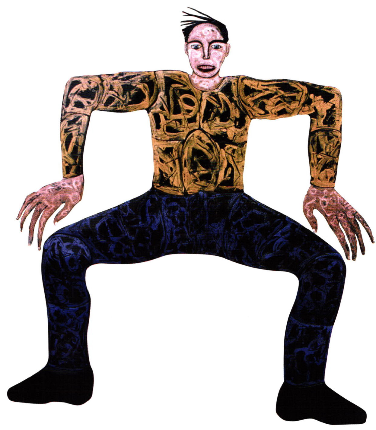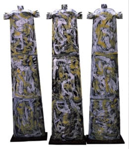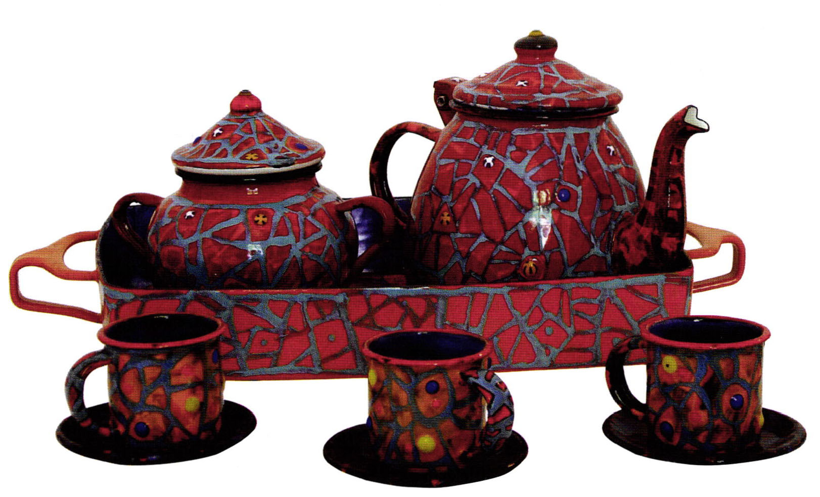 He works on steel pipes, found-objects, steel mesh, even car exhaust tubes. Mary of the pieces are soldered (which is usually done before firing), others are assembled with the use of rivets or screws, or tied with steel wires. After cleaning the piece, he applies a special ground. After firing this coat for four minutes, he starts building his design from the first layer; usually with sgraffito. The pieces are fired about two or three minutes at 750-800 degrees Celsius (1380″-1470 degrees Fahrenheit), anywhere from five to twelve times, depending on the design and size of the piece. The temperature is lower for firing reds.