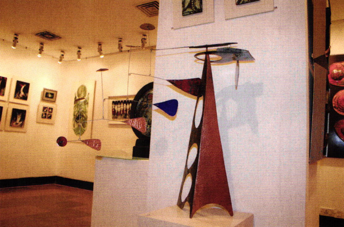 A playful side of Veenu's personality found expression in the mobiles, a small one with a beaten copper stand) another balanced on a sleek elliptical steel tube and a large bold black one with the lines of a Picasso bull. The carefully balanced metal cutouts were in patterned copper, brass and steel, some enameled, others left bare and some with patinas.