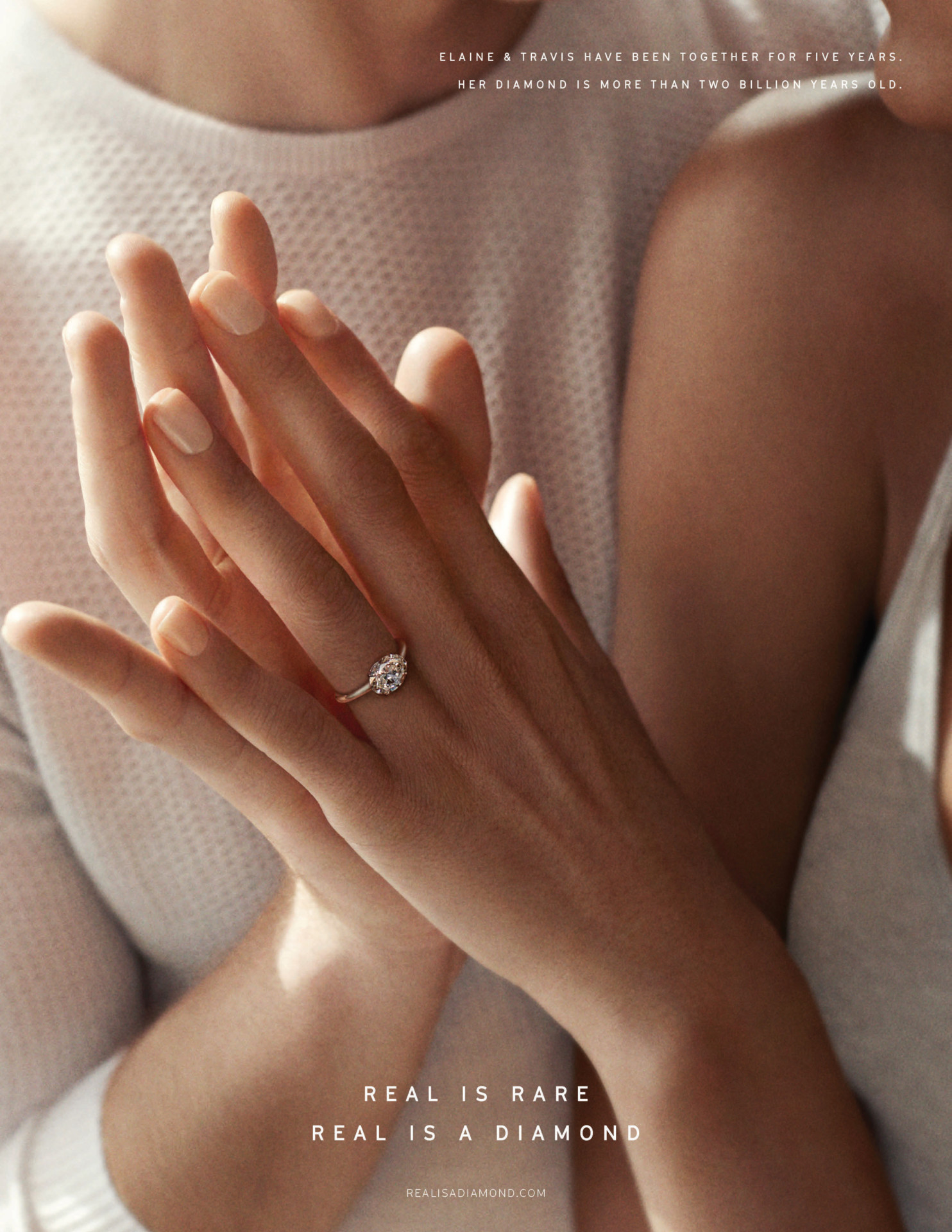 "While our long-term plan will reflect stories around growing areas of the market like self-purchase and family gifting, we started with love and commitment because they represent the biggest retail opportunity," she explained. "The objective is to link diamonds to the emotion versus the ritual. The couples are in love and committed, but their status is left ambiguous. This approach allows us to speak to committed couples planning to wed and those who are not."
