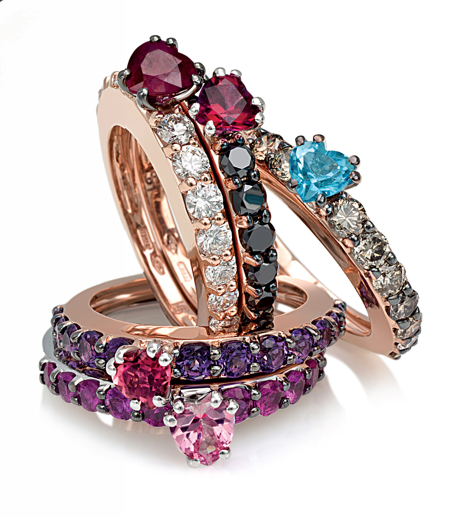 The fascination with stacking and layering shows no sign of waning, reports LeVian. The trend remains to stack multi-color gem and diamond rings and bracelets, as well as to layer different lengths, textures, and styles of necklaces, and climbers that offer a layered look up the ear. **