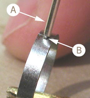 I fit the bezels to the gemstones. The featured items are; (A) The tip of the vacuum attachment and (B) A small piece of 1700 platinum solder. Using the ABI Tack II Welder with the vacuum attachment, I tacked a small piece of 1700 solder directly over the joint. The ABI Tack II Welder was set to 30 volts on the low energy setting. The tweezers lead is lined with platinum so no transfer of base metal from the tweezers will contaminate the platinum bezel material.
