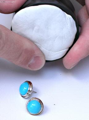 Next I pre-polished the earrings using Foredom's Platinum Blue and White polishing compounds. Using Foredom's Micro Motor and Hammer Handpiece, I set the stones. When I completed this stage of the setting, I removed the earrings from the Jett SetT by submerging them in warm water. The material became pliable and the earrings were easily removed. Steam removed any residual Jett SetT material from the earrings.