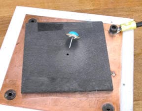 I drilled holes in the contact pad lead and graphite insulator. I placed the insulator over the larger hole on the contact pad and secured it by taping. This hole accommodated the post of the earrings during the fusion welding process. I sanded the graphite insulator pad flat and smooth to keep the backs of the earrings from becoming marred.