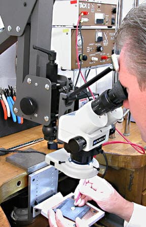 I filed the base of the posts flat and marked the center of the backs of the earrings. Using the ABI Tack II tack-welder, I tacked the posts. The tack-welding unit was set at 35 volts on the high-energy setting. I used platinum lined tack-welding accessories to avoid non-platinum metal transfer and contamination from the base metal tweezers or pliers to the platinum.