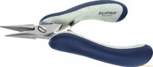 Made of ball bearing steel hardened to 45 Rockwell, these Supra flat-nose pliers feature a no-scratch/anti-glare satin finish, a lap joint with a fine-pitched screw for ideal joint adjustment and symmetry, and stainless steel dual leaf springs. The rounded ergonomic handles have a wide, soft, comfortable gripping surface. Overall length is 51/8 inch. Supplied by: Gesswein, 1-800-243-4466, gesswein.com