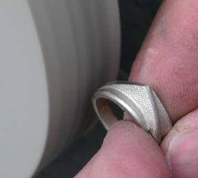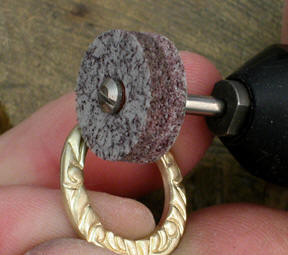 Here I'm using a 3A-very fine 3M™ General Purpose Unitized wheel to smooth and even the top surface of this 14-karat yellow gold ring shank. I was able to evenly smooth the rough casting without significant surface reduction.