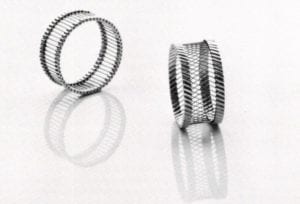 Ribero poetically characterizes his current work as "night and stars/black and diamonds." Prefabricated black industrial rubber washers of various dimensions provide the basic format for Ribero's rings, collars and bracelets—"jewelry to be worn in a direct relationship with the body" (he excludes brooches). Working with this rubber as a constant, Ribero explores formal concepts and endless theme variations by juxtaposing silver, gold and tube-set diamonds. Though he has produced a few hundred rubber and diamond rings, he prefers the one-of-a-kind and limited-edition designs which allow him to develop new ideas.