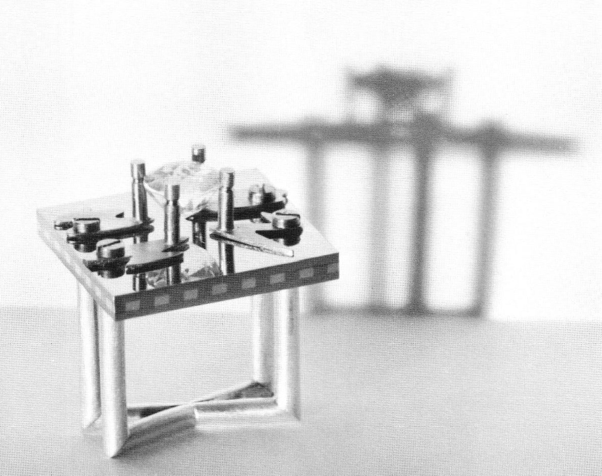 With collaborative input from industrial designer Reinhard Paulus, Ingrid Gossner's complex, layered, abstract images combine and juxtapose traditional goldsmithing and industrial techniques, "readymades," precious metals, plastics and jewels into "colorful pictures telling stories . . . myths and secrets."