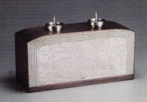 Boxes and other containers had quite a turnout. Bae Chang Sook's "Happy" and "For You" works are of particular interest. Although classic shapes, these works have a modern feel and are of subtle shades of sifted grays and tans. "Happy" is a candelabra yet stands on it's own sculpturally without it's function being obvious. Erin Gray submitted two sets of gourd pods "Denier" and "Believers" with enameled lids that were delicate and reminiscent of tiny pinch pots in their size. Despite their wide silver rims, the lids were so well designed as to appear an integral part of the gourds.