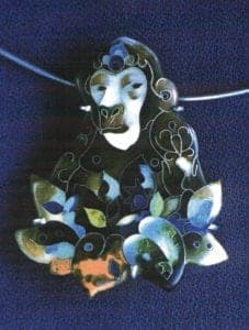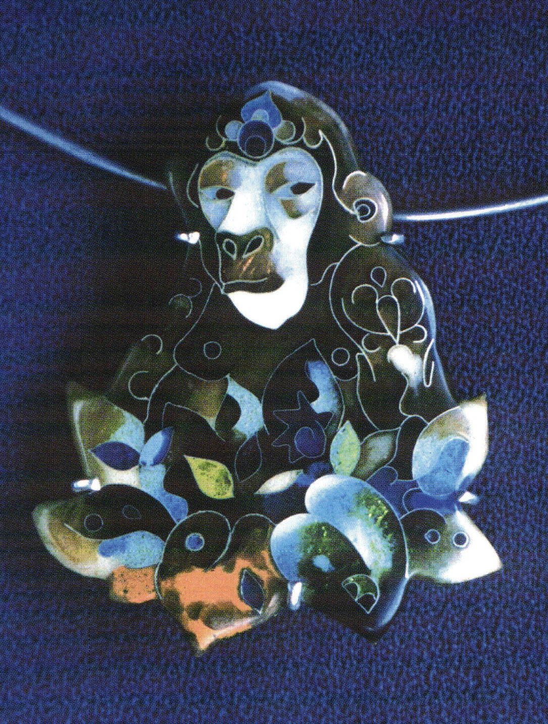 There were numerous method variations in the jewelry arena. Award winning "Dark Directions" by Jan Smith is a wonderful set of three medallions that descend from each other. They are dark enamel with sgraffito lines using liquid and sifted enamel. Metal prongs and rims were used for the settings settings. Nancy Bonnema's intriguing necklace, "French Knots", a reversible work, uses flattened thick wire to surround a pendant of sifted gray "stone", reminding one of an electron's circling pathways. Romualdo Medina's work, an elegant wire and metal leaf necklace named "Red Wesekh" is particularly handsome. Equally as appealing is Katy Bergman Cassell's "Olive", a basse-taille 'wreath' necklace suited for the Olympic winners. Lynn Christiansen's necklace of chain mail with dapped silver disks enameled in subtle colors would likely be better admired on a moving person with the disks glimmering. The Georgian contingent offered fine examples of cloisonné as jewelry, among other items. Nana Gigoshvili's "Moon" is a work with a sickle of metal below a medallion showing a woman with mottled variations of wet packed blues for her dress. Another work by this artist is a jeweled pin integrating the wire of enameled cloisons with a surrounding filigree of silver wires in a subtle and successful manner "Monkey," by Georgian David Bakuradze, captures one's interest as much by shading and outside shape as the concept of a monkey hanging off the wire necklace.