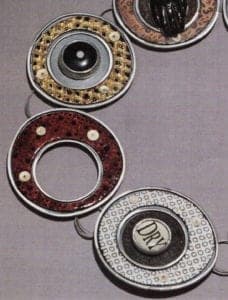 Anne Clark's flat figurines with titles such as "Pajamas III", David C. Freda's miniature, sculpted metal" Pink Lady Slipper Brooch" and "Study of a Newborn Snake with Leaves" were eye catching in their explorations of artistic thoughts. "Newborn" is a tiny snake hatching out of it's egg, which is next to two wet leaves of brown and green. This unusual topic is exquisitely explored in enameling and as metal work. Commercially successful jeweler Kimberly Keyworth's rich "enamel pebbles" start out with 4 layers of black enamel base topped by opaque colors. Her bracelet of 10 medallions is highly finished. Instead of using wire to separate the colors, she uses diamond burs to cut into the surface, then fills the voids and refires again with a torch using her custom mixed enamels (see "Ornament" magazine, Vol. 27, April 2004 for further information).