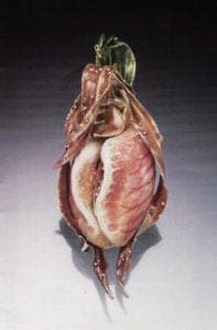 Continuations of particular artists' explorations into highly individual styles include Mary Chuduk's piece, "India Garment Brush". A large hank of what might be human hair descends from a fancifully enameled and shaped ferrule that is topped by a finial. The work appears symbolic and mysterious.