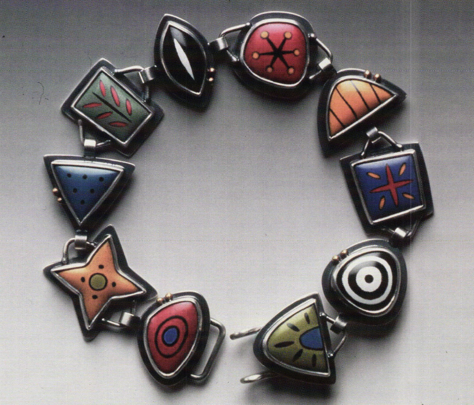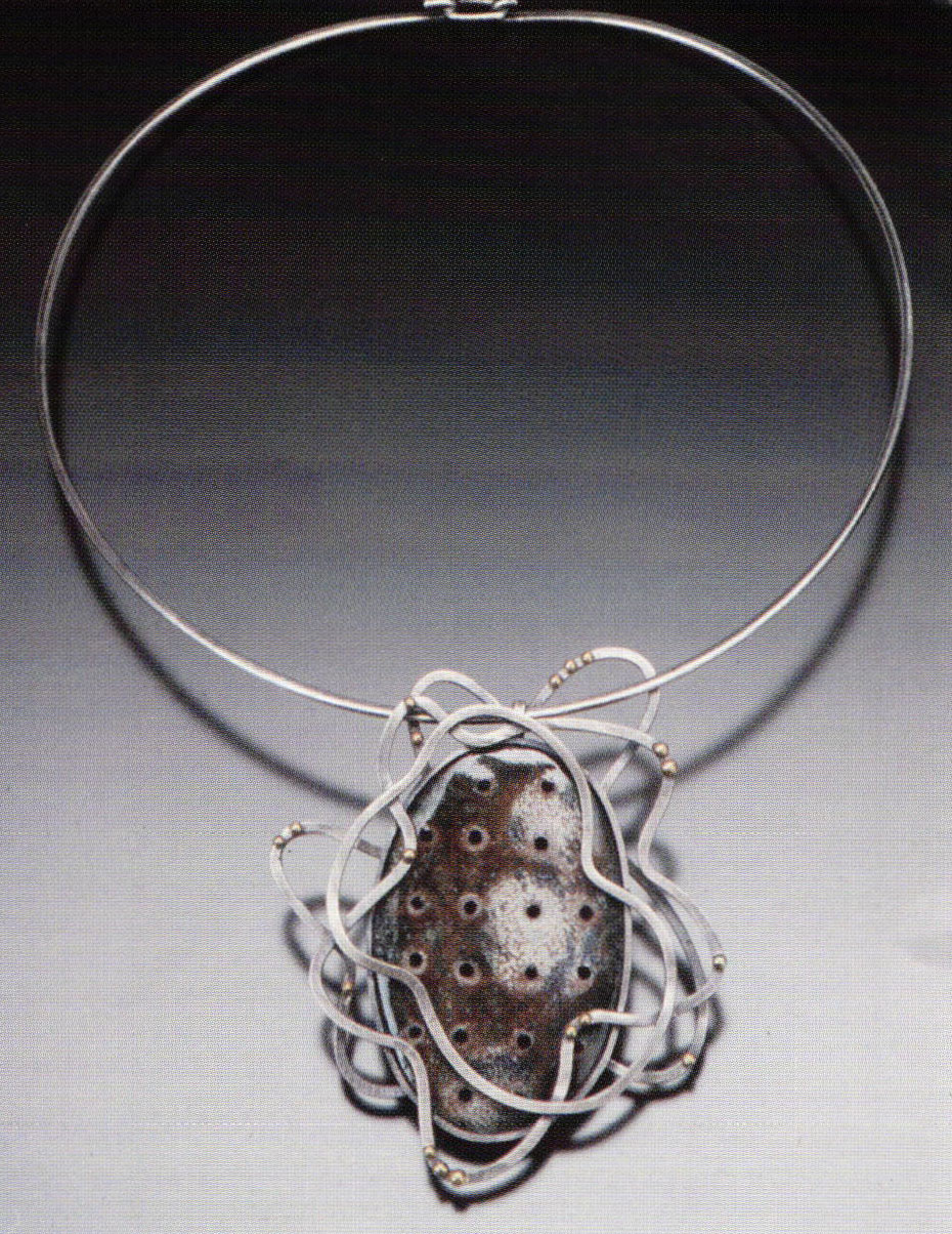 Matsouka's cut out and mounted birds, amusingly enough, appear to be perched on a tree of black ridged plastic and light plastic sky. The play of glossy, highly finished enamel with ridged plastic work very well together. Less light hearted, two of Harrell's works use gilded grids mounted high above the background causing shadow effects as well as the impression of imprisonment. Her third work, the catchily titled belt of medallions, "Osaka Obi/Houston Concho" is quite stylish. Karen Jablonski's award winning "Keep Reminding Me" (see cover, this issue) appears to be more of a work in colored pencil than that of enamel yet is actually stencil work and limoges, continuing the push to expand enamel's virtuosity that we have seen in John Killmaster's explorations. Hilde Haller's three works explored the use of gold leaf in apparently simple presentations that bore a closer examination. Her small wall work "Desiertos Rojos (Red Desert) " could be reworked in any proportion and still be of interest.