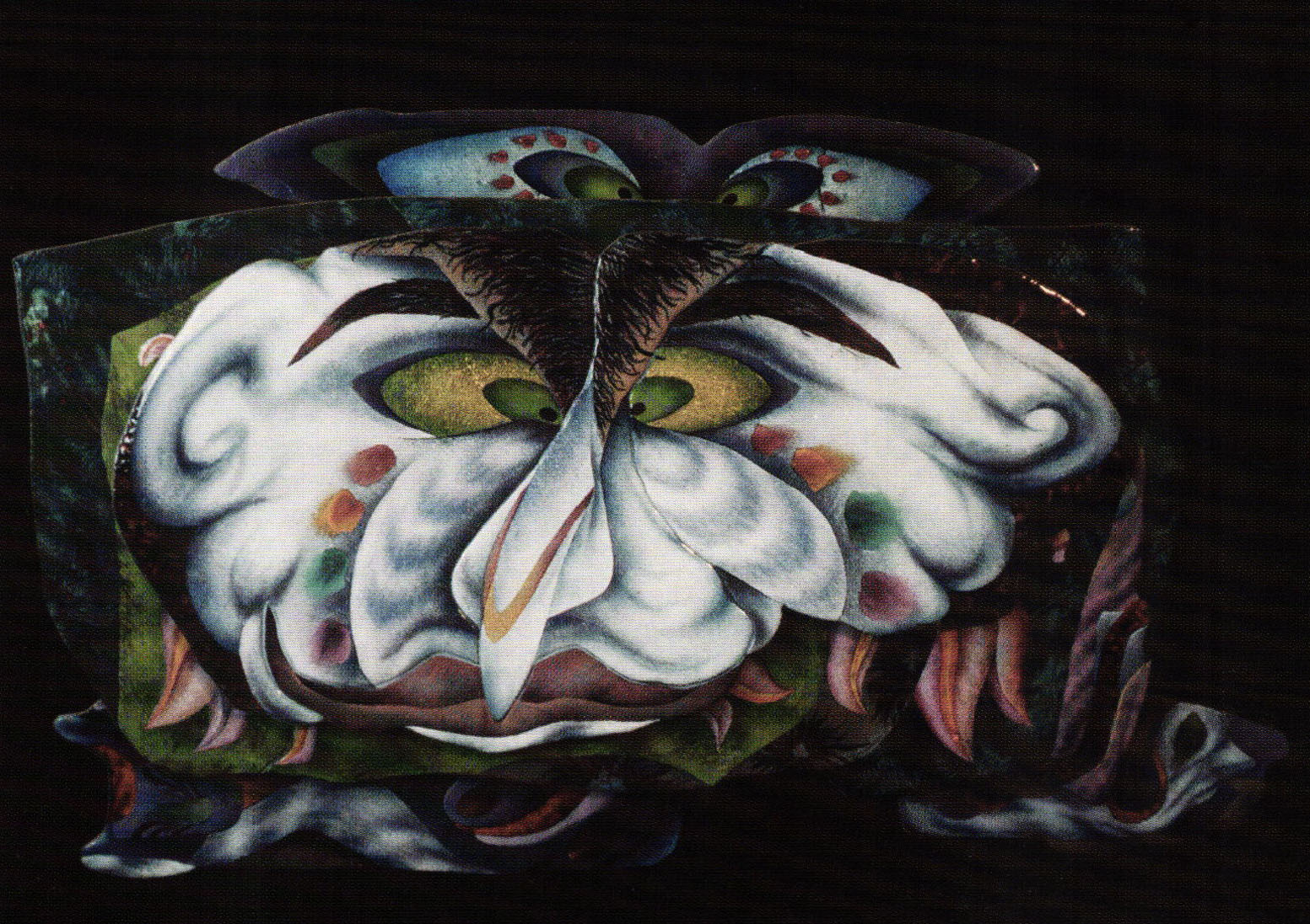 Wit and humor were in evidence with such pieces as Jill Baker's amusing kit of sifted, false fingernails titled "Nail". Clownish humor could describe "Masquerade", a gleeful mask and hidden person. This large, cut metal, saturated colors, large scale wall work by Herbert Friedson surprised viewers with it's attitude. Sifting, wet pack and foils were used. A quieter, second work of his was also shown. The Flying Flux group Roberta Smith, Vivian Stillwell, Pat Aiken and Jane Beiser - presented four self portraits mounted together as one entry. "Sanctum: Inner Promises" consists of four panels using various methods such as metal cutouts, repoussé and screen printing. One artist playfully encouraged the reception audience to match the members of the group with the portraits during the well attended reception.