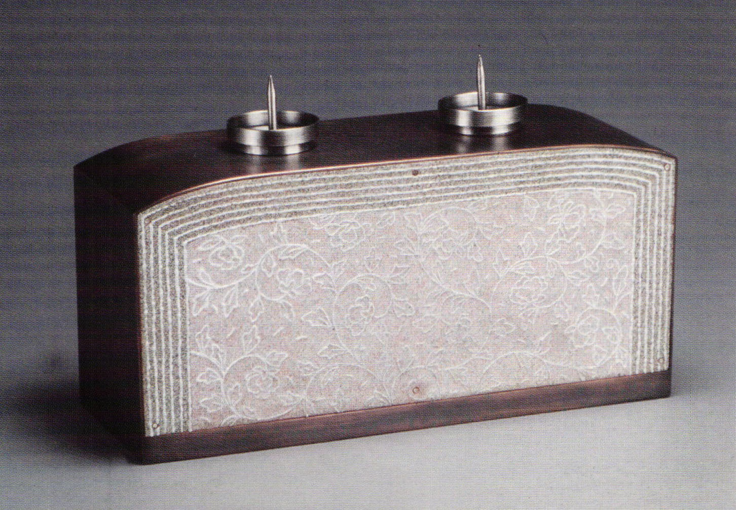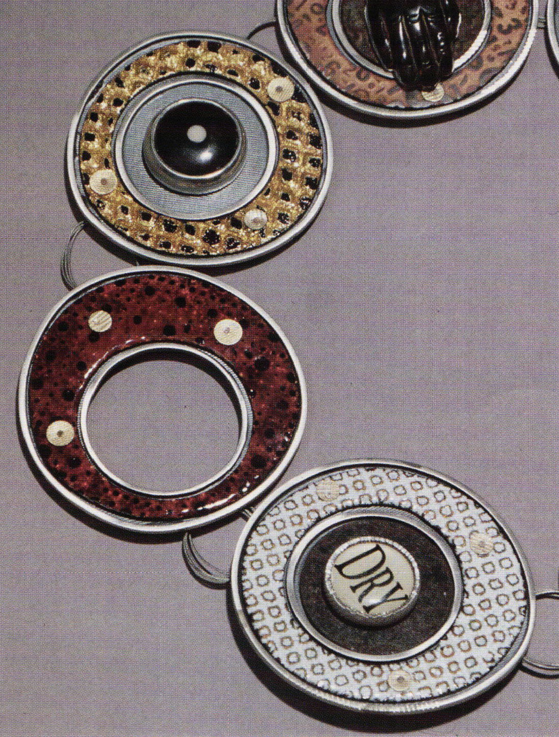 References to ancient enamel usages include Judy Foreman's reliquary "Chasse I" of rather rudimentary coloration while her other work, "Cloudmobile" was of a more contemporary feel and included horn embellishments.