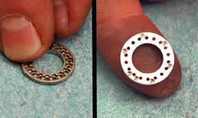 When palladium alloys are cast, platinum casting procedures are used. Investment or shell and investment molds for the casting process are granular and leave a minutely rough surface on the items cast. To remove this surface, McLaughlin sands the pieces using 3M abrasive products affixed to glass. To begin the progressive procedure he uses 3M wet or dry emery paper. Next he uses 3M Tri-M-Ite polishing paper. In this image, he's using 2 micron grit (equivalent to approximately 6,000 grit). Notice the luster on the surface. Tip: Using CAD technology gave McLaughlin the capability to precisely place assembly indentations on all pieces. You will see how this helps as the project progresses.