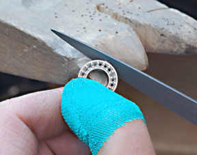 Tip: The size of the concave cup in the beading tool is slightly larger than the top of each prong. The beading tool is placed on the top of the prong and rotated in a small circular motion while applying downward pressure. 950 palladium is malleable and workable so only moderate pressure is required.