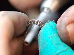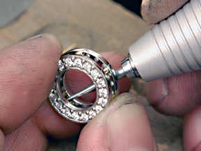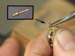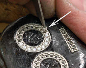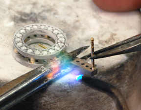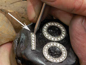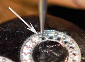McLaughlin prepares the seats for 3 diamonds at a time. Next he places the diamonds in them. He does this by placing a small amount of adhesive material at the end of his flat bottom graver, picks up a diamond and then sets it in place. He then uses a brass probe with a blunt end to push the diamond into its seat.