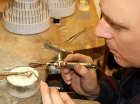 McLaughlin flows solder into assembly indentations he made at the end of each top plate. With cross-locking tweezers holding the connector that's been threaded through the earring, McLaughlin carefully solders the connector to the end of the top plate.