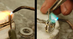 He flows 18-karat easy yellow solder into the indentations at the top of each plate and then solders the earring posts as the final step in the soldering process. McLaughlin completes the polishing with platinum blue and white compounds. The white is an 8,000 grit compound and brings out the final luster of the bright-white 950 palladium.