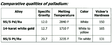 The specific gravity of 950 palladium is close to that of 14-karat white gold and nearly half the weight by volume of platinum. At the time of this writing, the daily market price of platinum was $892.00, gold was $440.00 while palladium was listed at $182.00 per ounce. The lightness of the 950 palladium alloys and pricing considerations, make them prime candidates for use in the creation of a broad spectrum of fashionably affordable as well as classically influenced jewelry designs.