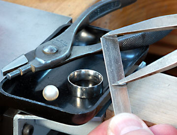 palladium fabricationThe 950 palladium low dome half-round wire on the left measures 8mm wide and is 1.7mm deep and will be used for the inner shank with the rounded contour inside the finger hole. The wire on the right measures 10 x 1.5mm and will be used for the outer shank with the rounded contour on the outside. The flat sides of the wires will face and become the joint surfaces.