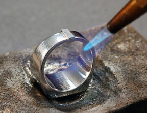 With a large vented torch tip, the ring shank was heated directly and evenly from side to side. Palladium has low thermo conductivity so the heat stays concentrated where the torch is directed. The solder reached its melt and flow point as the ring was heated and the soldering procedure completed.