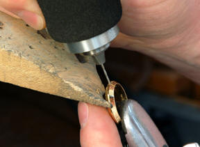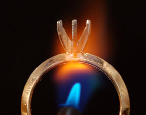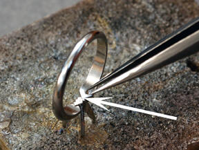 After preheating, a small amount of flux was placed around the base of the setting. The assembly is again heated with a vented torch tip from the finger hole. The heat is conducted upward and the 14-karat white easy solder flows from the base of the peg upwards through the shank and around the base of the setting.