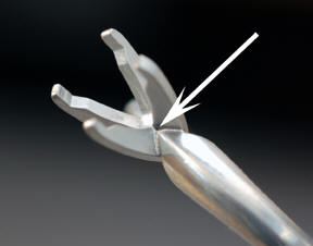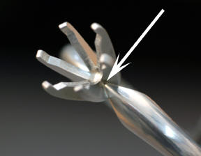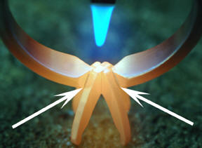 This image shows the soldering process being conducted through a No. 5 welding lens. A torch tip with no vents and an opening of about 1.2 millimeters is used to directly heat the joint. The torch is positioned so the hottest part of the flame (the area about a 1/4 inch beyond the blue cone) directly heats the joints. The torch is moved slowly from side to side. Because of the low thermo conductivity of palladium, the heat is concentrated in this specific area. The ring is heated and the solder flows down each side. The torch is pulled away as soon as the solder has flown to avoid overheating, pitting or melting. The arrows indicate the small amount of excess solder on each side of the junction of the setting and shank.