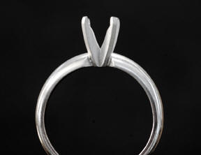 The setting was fit into the shank. Because the peg is slightly tapered, the base of the setting and the shank do not meet. If soldered at this step, the setting is sure to be lost during normal wear. The soldering process naturally anneals the peg. With no contact between the shank and the base, the peg will bend back and forth and eventually break while being worn. The setting and the gemstone in it will both likely be lost. Tip: ALWAYS have good contact between the base of a peg setting and the shank. This image shows INSUFFICIENT contact and the assembly will fail during normal wear.