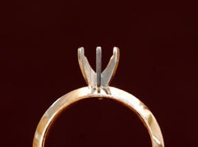 The assembly was air cooled and then pickled, rinsed and inspected. Notice the solder filled completely around the joint between the base of the setting and the shank. Because this assembly contains both 14-karat gold and 950Pd, it must be appropriately hallmarked indicating both alloys are present. Tip: When soldering 950 palladium to karat gold, it is important that cadmium-free solders are used. If not, the resulting joint will fail under normal wear.