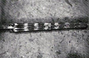 Once the general pattern was determined, it was time to start making samples in order to work out the specifics. The seven layers of each "interrupted twist" bar could be clearly counted in the radiograph. The exact number of revolutions of each twisted section was not quite as clear, but the average was four complete turns. This number turned out to be the maximum amount the bars could take without shearing. When forged to the final form, each twisted and straight section needed to be 5.3 cm long.