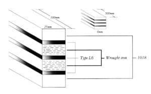 For the eight billets used to construct the core, two other steels, 1018 and Type L6, were selected to be combined with the wrought iron. These were chosen for their physical characteristics and for the contrast that they provided when the finished blade was etched.